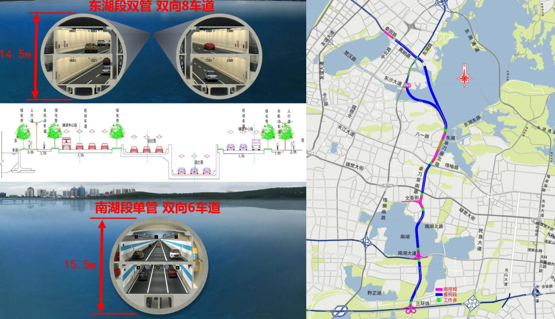 為更好地支撐城市空間發展,武漢市“十三五”規劃中要求“加大地下空間開發利用度,加強地下通道、地下停車場等地下交通設施建設,啟動實施‘負高架’工程,改善交通出行條件”。兩湖隧道作為世界上規模最大的城市湖底雙層超大直徑隧道,是武漢市重點市政工程,也是惠及武漢千家萬戶的重大民生工程。項目建成后,將在武昌片區形成一條南北向快速通道,可有效緩解二環線、珞獅南路、水果湖隧道等道路交通壓力,不斷完善區域路網體系,方便周邊地區居民出行。